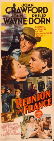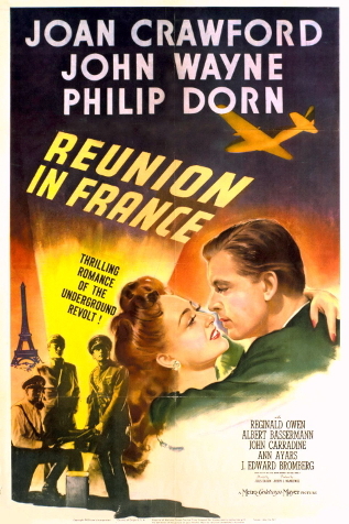 回到MGM,瓊的下部電影是[Reunion in France/在法國重逢/諜網英雌]. 這部戰爭愛情戲劇電影改編自Leslie Bush-Fekete 的故事,由 Jan Lustig+Marvin Borowsky-Marc Connelly撰寫劇本,Charles Hoffman特約撰稿人. 講述在德國佔領的巴黎,一名女子在得知她富有的情人和德國有聯繫後,不顧可疑的蓋世太保官員的嚴格監視,試圖幫助一名被擊落的英國皇家空軍飛行員偷渡到葡萄牙。 這部電影的工作名稱是[Reunion] 根據 1942 年 12 月 14 日的《HR》新聞報道,片名改為[Reunion in France], 上映日期提前到 1942 年聖誕節,以利用近期人們對法國戰爭的興趣日益濃厚。