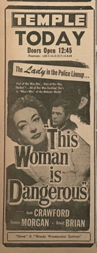 正如克勞馥和華納本人可能預料的那樣,[This Woman Is Dangerous]票房慘淡,也為她帶來了一些最糟糕的評價。 《紐約時報》的Bosley Crowther帶頭嘲笑…事實上,他對克勞馥的攻擊——他幾乎從未對她說過一句好話——迫使克勞馥請她的朋友、出版商Lawrence Quirk幫忙,弄清楚他為何如此憎恨自己。 Quirk(他的職業生涯始於與Crowther的合作)只是告訴她,這位評論家「品味相當刻板」。