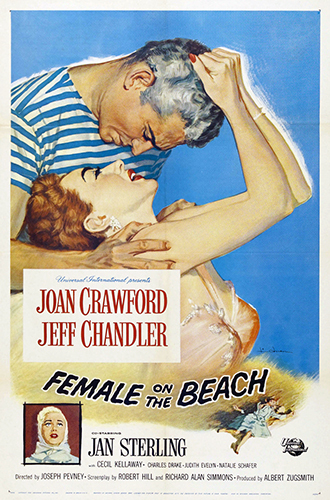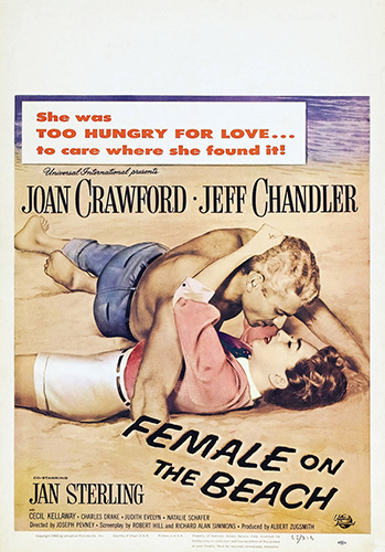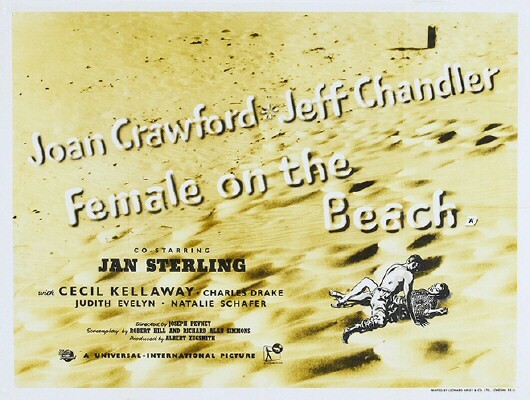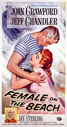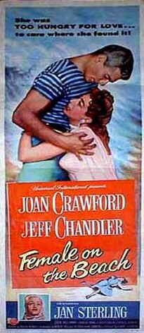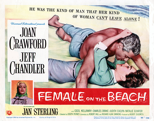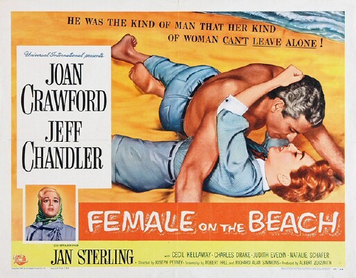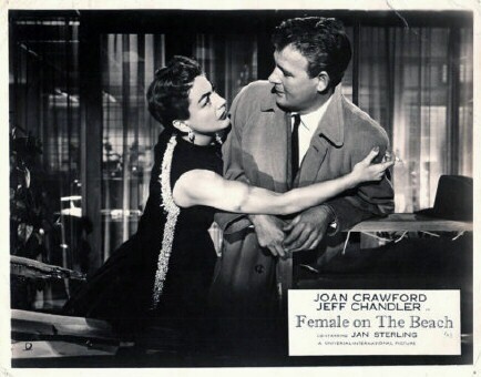 雖然瓊沒有當成環球影業老闆娘, 但舊愛Milton Rachmil仍邀她主演環球的[Female on the Beach/海灘上的女人/海灘怨婦]. 這部犯罪懸疑心理驚悚片根據Robert Hill未製作的戲劇[The Besieged Heart/被圍困的心], Albert Zugsmith購買版權並與Bob Hill一起製作劇本。
