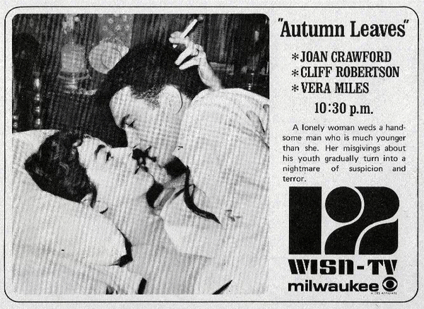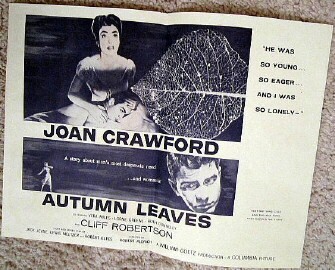 「導演Bob Aldrich問我是否願意去克勞馥家做客。週日下午,和她一起審查劇本,」「當我到達那裡時,我被領進客廳,那裡有白色的沙發、白色的枕頭和白色的地毯。在房子的後面,兩個穿著白色襯裙的小女孩正在和兩隻白色的法國貴賓犬玩耍。 百事可樂先生[Al Steele]站在希臘白色泳池區旁邊,兩邊各有兩座白色泳池屋。 然後我看到了瓊。她躺在白色躺椅上,戴著墨鏡,一邊修指甲和修腳,一邊向坐在一側的秘書口述信件。 她拍了拍另一邊的椅子,我就坐在那兒,每當她有空的時候,我就唸台詞給她聽。她把『女主角』扮演得淋漓盡致。 就連克里夫·羅伯遜——[秋葉]是他在[Picnic/野餐](1955)擔任配角後首次擔任主角——在拍攝前,克勞馥也在她家中親自“試鏡”。(TCM) 在後來一部瓊克勞馥紀錄片的採訪中,克里夫羅伯遜回憶起他在瓊克勞馥家中與她的第一次會面。 與傳奇人物克勞馥一起工作已經讓他有些害怕,他被放了進去,然後聽到她在泳池邊曬太陽的呼喚,“出來吧,親愛的孩子。我們一直在等你。” 羅伯遜對克勞馥的天賦和令人難以置信的技術紀律只有欽佩。 有一次,導演Robert Aldrich想讓克勞馥哭,但只是輕微地哭一兩滴眼淚。 “哪隻眼睛?”羅伯遜記得克勞馥這樣問。然後驚訝地重複了這件軼事,“‘哪隻眼睛?’”