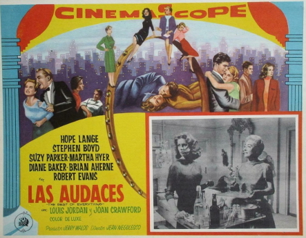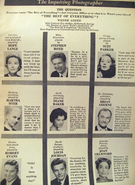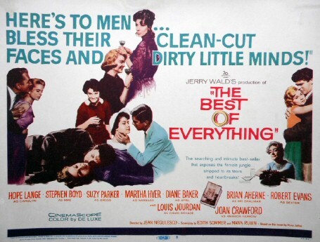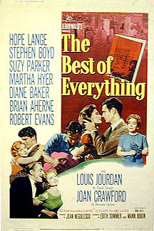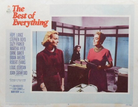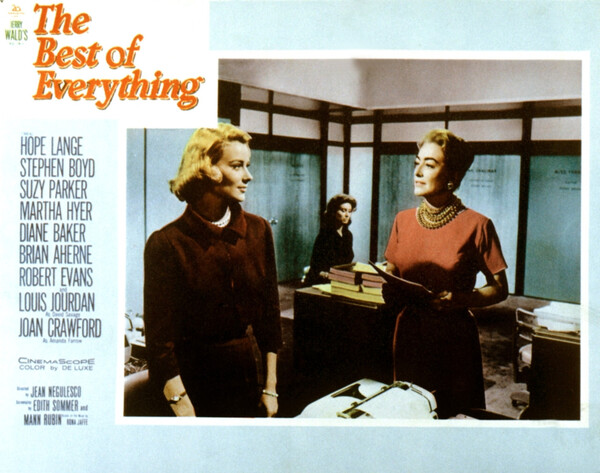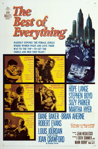 在Alfred Steele葬禮後,朋友Jerry Wald邀請他在二十是福斯電影[The Best of Everything/最好的一切/冷暖群芳]客串一角. 戲份不多,但瓊說只要角色好,她不介意. 這部職場愛情劇情片改編自Rona Jaffe1958 年的同名小說。 Edith Sommer和Mann Rubin編劇.瓊克勞馥-劇本修改(uncredited) 講述三位女性的職業生涯和私人生活,她們合租一間小公寓,在紐約市的一家平裝書出版公司工作。 導演Jean Negulesco.製片人Jerry Wald. William C. Mellor攝影。Robert L. Simpson剪輯 藝術指導:Mark-Lee Kirk,Jack Martin Smith,Lyle R. Wheeler. 服裝設計:Adele Palmer. Alfred Newman音樂──這是他作為二十世紀福斯音樂總監長期合約下的最後一部配樂。 主角:賀蘭芝(Hope Lange), 史蒂芬鮑育(Stephen Boyd), 蘇西帕克(Suzy Parker), 瑪莎海爾(Martha Hyer),黛安貝克(Diane Baker), Brian Aherne, Robert Evans, 路易喬登(Louis Jourdan)&瓊克勞馥(as Amanda Farrow)客串主演 要角:Brett Halsey,Donald Harron,June Blair, Sue Carson,Linda Hutchings. 瓊的酬勞為6.5萬元.