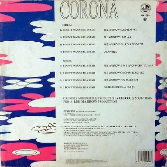 科羅納(Corona)是一個義大利歐陸舞曲組合。 最初,樂團由巴西裔義大利歌手兼模特兒 Olga Maria de Souza 和製作人 Francesco "Checco" Bontempi(又名 Lee Marrow)組成. 第二張專輯發行後,Bontempi 離開了樂隊,由 Francesco Conte 和 Paolo Dughero 接替。 1993年11月推出首支單曲[The Rhythm of the Night/夜之節奏],1994年走紅國際. 1995年4月,科羅納推出首張大碟[The Rhythm of the Night/夜之節奏](Warner Music/ZYX唱片發行),由Checco & Soul Train製作. 登上英國專輯榜#18,澳洲#10──金唱片(3.5萬張) 法國#26,芬蘭#30,瑞士#35,日本榜冠軍. 1995年11月,科羅納推出大碟第四單曲[I Dont Wanna Be a Star/我不想成為明星], Francesco Bontempi、Antonia Bottari和Ivana Spagna創作 Checco+Soul Train製作成一首Techno/歐陸House/迪斯可,節奏快速,舞曲節拍強勁,獲得好評. [I Dont Wanna Be a Star]登上義大利單曲榜冠軍,西班牙冠軍 英國榜#22,荷蘭#16 法國#18,芬蘭#6 奧地利#25瑞典#37,德國#69. 澳洲#109 歐洲榜#23