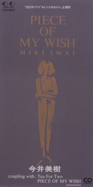 1991年11月7日,28歲半的日本氣質歌姬今井美樹(Maki Imai)推出第7首單曲[PIECE OF MY WISH/我願望的片段](FOR LIFE RECORDS發行). 由岩里祐穂作詞,上田知華作曲,佐藤準編曲, 被製作成一首城市流行抒情曲,旋律優美,編曲細緻, 今井以溫柔的唱腔娓娓演繹,有如夜風拂面般舒適. 作詞人岩里祐穂表示,此前她主要創作情歌,但[PIECE OF MY WISH]是她第一首完全不包含任何浪漫主題的歌曲。她說:“我想寫一首擁有更廣闊世界觀的歌曲,一首能鼓舞人心、鼓勵人們相信自己、即使在困境中也能保持積極樂觀的歌曲,所以我很高興能夠做到這一點。從這個意義上來說,我覺得這對我來說是一個重要的轉折點。” 順便說一句,岩里祐穂當時已經懷孕八個月,她回憶道:“這首歌是伴隨著我的分娩而誕生的(笑)。” 此曲是今井美樹主演的TBS週五劇集《あしたがあるから/明日有你/愛有明天》的主題曲。 [PIECE OF MY WISH]在1991年12月登上日本公信榜三週冠軍,也是當月銷售冠軍, 上銷售125.4萬張,名列1992年日本最暢銷單曲#9.為美樹事業第二成功單曲. [PIECE OF MY WISH]收在1993年11月10日推出,今井第二張精選輯[Ivory II]中. [Ivory II]登上日本公信專輯榜冠軍 名列1993年日本最暢銷專輯#33.銷售45万7850張. 名列1994年日本最暢銷專輯#34.銷售43万7550張. 至今賣出120萬張.