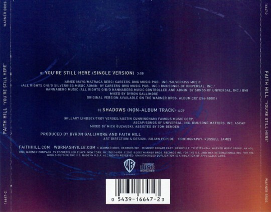 2002年秋天,35歲的美國鄉村-流行新天后費絲希爾(Faith Hill)推出了個人參與製作的〔Cry/哭泣〕大碟(Warner Bros. Nashville) 再度拿下美國專輯榜冠軍 由於上一張〔Breathe/呼吸〕在美大賣800萬張/全球1000萬張 讓她成為華納在美國本土最暢銷的女歌手. 〔Cry/哭泣〕專輯依舊維持上一張傾向成人抒情的Country-Pop型式 雖然〔Cry〕仍本土賣出兩百多萬張 但大碟跟單曲的整體成績卻不如〔Breathe〕 [Cry]同名單曲成績差強人意(美國流行榜#33 成人抒情榜冠軍 加拿大#3 英國榜#25) 全球銷量僅370萬張。 2003年4月28日,費絲推出第五單曲[Youre Still Here/你依然在這裡] 由Matraca Berg和Aimee Mayo創作 希爾與Byron Gallimore製作成一首鄉村流行/抒情曲, 在緩慢的絃樂聲中,費絲以深情投入的唱腔娓娓演繹.