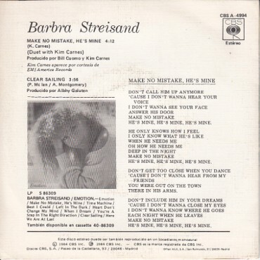 第二主打[Make No Mistake, Hes Mine/別犯錯,他是我的]在1984年12月發行, 由芭芭拉·史翠珊與歌曲作者金康尼絲(Kim Carnes)合唱, 登上美國告示牌單曲榜#51,副榜──成人當代榜#8. B面歌曲為[Clear Sailing/一帆風順], 由Peter McIan, Anne Black Montgomery創作, Albhy Galuten製作成一首成人流行抒情曲,旋律悅耳, 編曲精緻,在優美的樂聲中,芭芭拉以溫柔細膩的唱腔娓娓演繹,溫馨迷人. 這是史翠珊的隱藏抒情佳作之一.