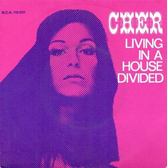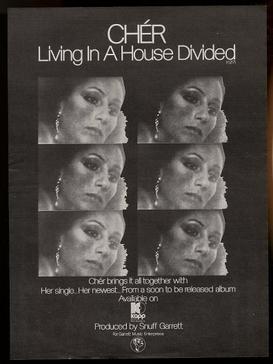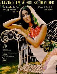 美國演藝巨星[雪兒]──軟式搖滾/抒情曲──[Living in a House Divided/生活在分裂的房屋] Look at us, the picture of happiness Living in a house divided with a love thats so one-sided Look at us, the king and queen of emptiness Living in a house divided with a love thats so one-sided Living in a house divided with a love thats so one-sided 1971年,美國演藝紅星雪兒(Cher)第七張個人專輯[Cher]重振聲勢, 單曲[Gypsys, Tramps&Thieves/吉普賽,流浪者&賊]登上美國單曲榜后座 成為雪兒首支冠軍曲(百萬金唱片),提名葛萊美流行女歌手. 英國榜#4) 由於單曲成功,專輯也順勢改名為[Gypsys, Tramps&Thieves],登上專輯榜#16,平了她當時個人大碟最高名次. [The Way of Love]也登上美國單曲榜#7. 並讓專輯表現一向普通的雪兒首度拿到大碟類的百萬金唱片.