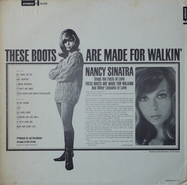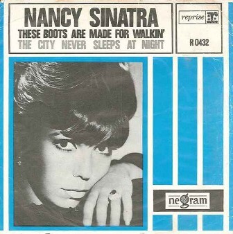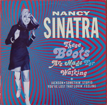 1965年12月,25歲半的美國歌手南西辛納屈(Nancy Sinatra)推出單曲[These Boots Are Made for Walkin’/這些靴子是做來走路的], Lee Hazlewood創作,歌曲靈感來自法蘭克辛納屈(Frank Sinatra)在喜劇西部片《德州四勇士/4 for Texas》(1963)中的一句台詞:「他們告訴我,這雙靴子不是用來走路的。」 Lee Hazlewood原本打算自己錄製這首歌,他說“這首歌其實不太適合女孩唱”,但法蘭克辛納屈勸他放棄了這個想法,說“如果由一個男人來唱,會顯得粗暴無情,但很適合小女孩唱”。Hazlewood同意了。 Lee Hazlewood製作成一首融合民謠搖滾/go-go/鄉村/流行,節奏輕快,受到好評. 《告示牌》雜誌將這首歌描述為“優秀的民謠搖滾作品”,並讚揚辛納屈的演唱以及“Billy Strange創作的動感舞曲節奏”。 《Cash Box》雜誌則將其描述為“一首節奏歡快、慢節奏的民謠搖滾,講述一個女孩向男友發出警告,表明自己不會任人擺佈的故事。” [These Boots Are Made for Walkin]走紅全球,登上美國告示牌單曲榜冠軍──金唱片(100萬張+) 英國冠軍──銀唱片(45萬張+) 西德#2──(40萬張+) 加拿大冠軍 澳洲冠軍 荷蘭冠軍──(10萬張+) 丹麥冠軍 愛爾蘭冠軍 紐西蘭冠軍 義大利#3──金唱片(5萬張+) 挪威#3 芬蘭#4 瑞典#5 瑞士#5 奧地利#7 法國#13 西班牙──金唱片(13萬張+) [These Boots Are Made for Walkin]收錄在1966年3月推出,南西辛納屈的首張錄音室大碟[Boots/靴子](Reprise唱片發行),為其第二單曲. 專輯由Billy Strange編曲並指揮,Lee Hazlewood擔任製作人。 大碟登上美國告示牌專輯榜#5,1966年底認證金唱片(100萬張+) [These Boots Are Made for Walkin]讓南西一炮而紅. 2020年,[These Boots Are Made for Walkin’]1965年的錄音版本入選葛萊美名人堂。 南西在當時的一段電視宣傳片,身穿高筒靴,與一群身著艷麗服裝的舞者一同亮相,已成為如今被視為1960年代搖擺風潮標誌性造型的經典畫面。
