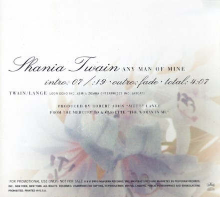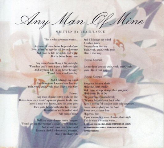 〔Any Man of Mine〕是仙妮亞唐恩的成名作 樂風獨特 旋律討好 特別是在舞台上相當炒熱全場氣氛 只要看過仙妮亞的演唱會就可以知道那種全場合唱的盛況 鄉村樂流行化已經多年 不過仙妮亞卻是最成功的一位 唐恩是MTV年代最善用音樂錄影帶包裝的女歌手 唱片公司將其塑造成一名美麗 幽默 大膽 俏皮 又有主見的新時代女性 她的火紅也帶動一連串鄉村女歌手褪去鄉土外表 積極在曲風 包裝時尚性感化以跨界到主流市場 像後來的黎安萊姆絲(LeAnn Rimes) 費絲希爾(Faith Hill) Taylor Swift都是著名的例子 推薦這首熱情的鄉村/流行經典給各位