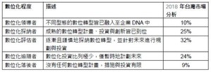 根據數位轉型指數,僅有10%的台灣企業被歸類於數位化領導者;有四分之一的台灣企業被歸類於數位化採納者,這類企業有成熟的數位化計畫與創新力量來驅動轉型。然而,近乎相同比例的台灣企業被劃分為數位化追隨者以及落後者,意謂著這些企業轉型步調過於緩慢,或根本沒有擬定數位轉型計畫。而最高比例的台灣企業則處於中段班(數位化評估者)。