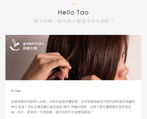 生活化主旨及內容:讓訂閱者知道你不只是在寄寄廣告信而已 儘管綠藤生機是社會企業,它也與一般電商相同,需要依靠銷售產品來維持營收,但不同的是,綠藤的電子報主旨大多從訂閱者的生活情境切入 .在夏日時分,介紹了頭髮的照料與保養,文末順勢推廣自家的洗髮精; .在換季之時,在內文中分享三個換季的保養小技巧外,之後再分享自家溫和的保濕液; .在有陣子台灣空氣品質不好的時候,它也分享了四個有效預防空污傷害的保養法(這一篇文末只有更多的衍生內容,並沒有導購產品)。