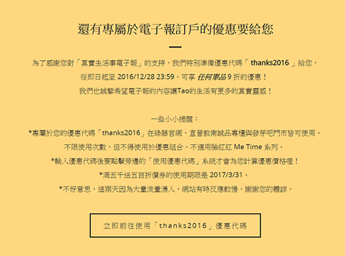 這樣的作法,不僅讓訂閱戶、消費者更認識這個品牌,也會對於它的所作所為更有印象(當然,前提是讀者對於此內容並不排斥),久而久之,你的「存在感」就更重了,消費者自然在消費時有機會把你納入選項。 而電子報的性質:較能精準地送到每位會員手上、有較充裕的版面進行溝通、單位推廣成本低廉,都恰恰很適合作為深度溝通的渠道。 而且,一旦在電子報的內容規畫中增加了不同類型的素材後,訂閱戶對於必不可免的推銷,也能有較高的容忍度和彈性,因為讀者知道不會每封信都是廣告,而有一些內容也值得期待,對於長期的開信率而言也會有所幫助。 認真對待你的電子報訂閱戶 相比於一般電商,電子報只是提醒訂閱戶「同樣的廣告優惠」,點進連結後發現,其實「就算是你的會員,好像也沒有什麼特別的」,自然對於你的電子報不會有太多期待。 而綠藤在周年慶的時候,依然推廣了自家的主力產品,但不一樣的是,它提供了訂閱電子報訂閱戶專屬的優惠代碼。