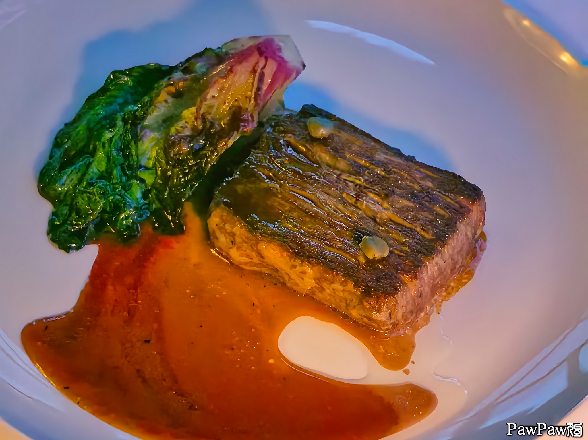 昨天那家三星餐廳晚餐的其中一道菜。乍看不過是塊普通的和牛,但用叉子叉下去才發現這不是一塊牛扒而是已經切成薄片但仍然保持一整塊牛肉的形狀。更難的是外表是煎過,但裡面卻仍然是五分熟。這對於一整塊牛扒不難,但對已經是片狀的肉要處理火候的難度就大多了。當然最重要的是這“塊”肉不用刀子就可吃並入口即化,至於美味就更不用說了。