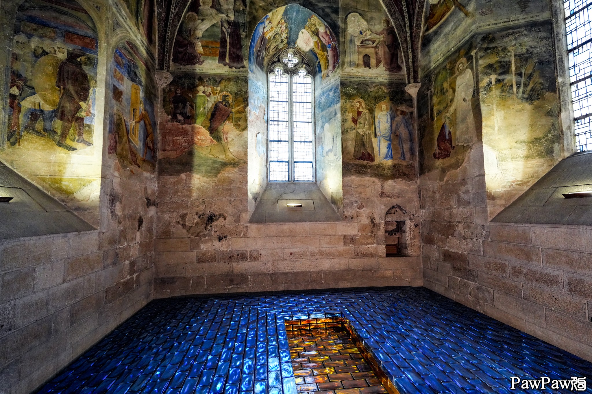 話說亞維農的教宗宮不僅大且高,裡面有數不清的大大小小房間及廳堂,其中這間看似原來大約是個禱告室不算大的房間的牆上有著特別多的壁畫。大狗沒去詳看這些壁畫的年月,不過這教宗宮內所有的壁畫大約上畫於13-18世紀之間,也就是說起碼都有三百來年的歷史。至於地面上鋪的則是當時正在舉行的什麼琉璃“藝術”展的琉璃磚。
