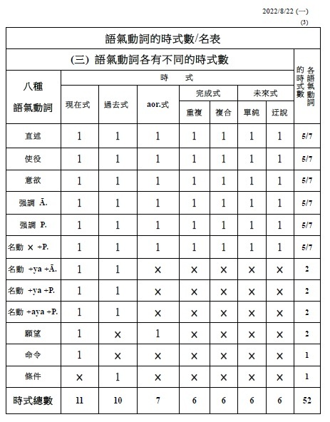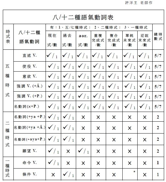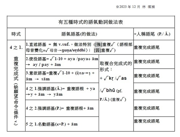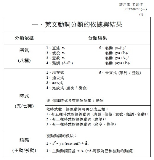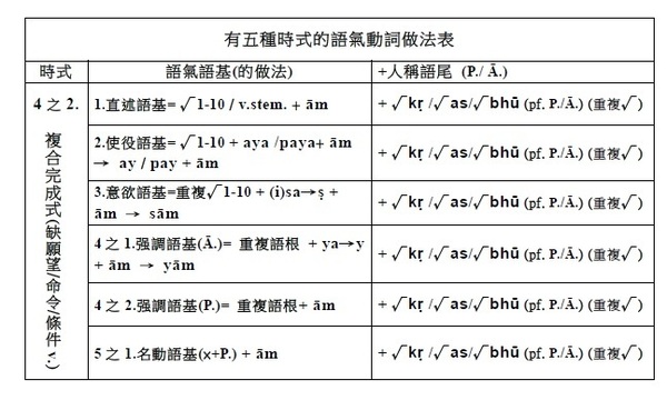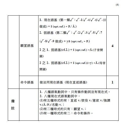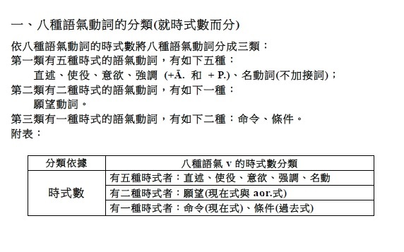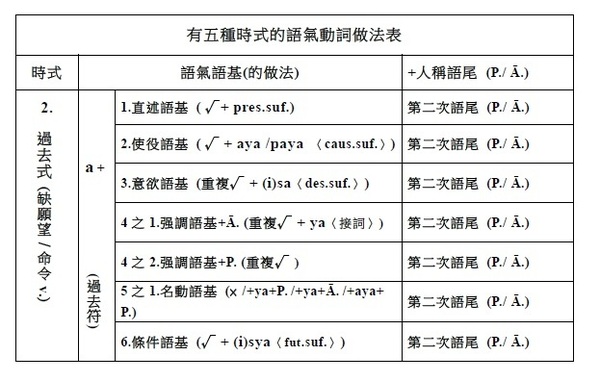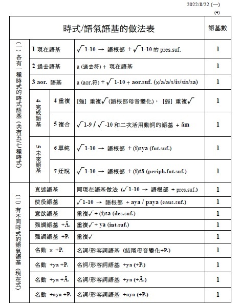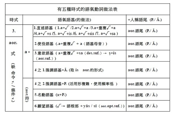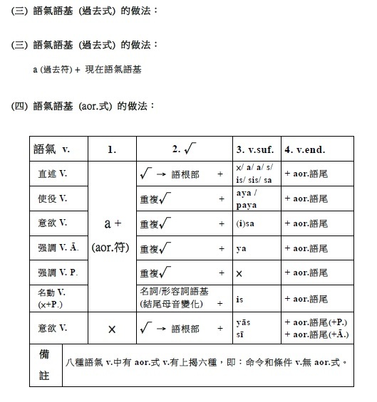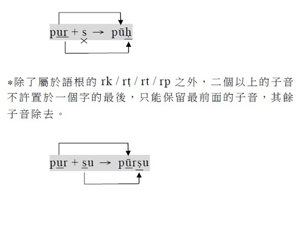 注意: 1.有聲音+有聲音 2.無聲音+無聲音 3.一母音後不可接另一母音,即二個母音不可連在一起 (會起變化:同種母音長音化,異種母音則變成另一母音,如a+i→e)。 4.一子音後不可接另一子音,即二個子音不可連在一起 (二個子音之間須插入母音i)。 . §38. 被動語基是在動詞的語根後附加ya (pass.suf.)而作成的。此時,
