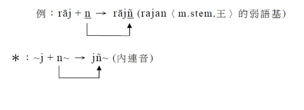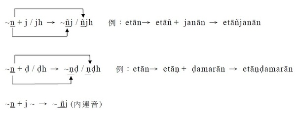 3. 接j / jh;ḍ / ḍh,則n分別變成ñ / ṇ。