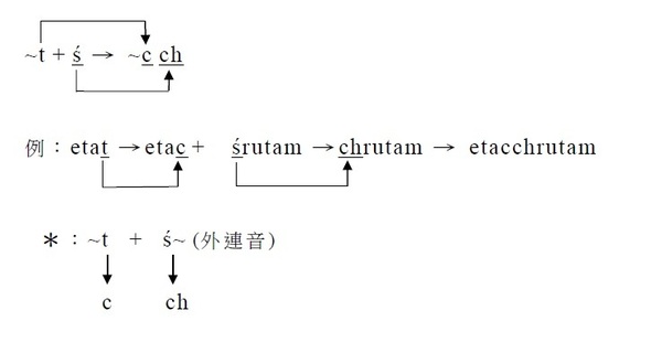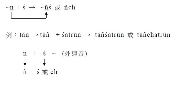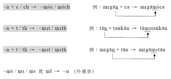 1. 接c / ch;ṭ / ṭh;t / th;則n分別變成ṃś / ṃṣ / ṃs。