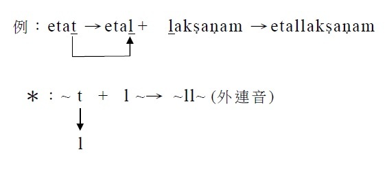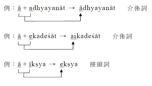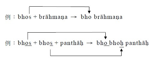 例:catur (num.4.) → catuṣ + taya→ṭaya → catuṣṭaya (adj.stem.) 四個的 . §42. 在namas / puras / tiras等不變化詞之末的s,有時於kṛ之前不變為ḥ,依然是s。 ﹝例1﹞:tiras (adv. 歪斜地) + kṛta (ppp.) → tiraskṛta (ppp.→adj.stem.) 被叱責的 ﹝例2﹞:puras (indec. 在……之前) + kārya (fpp.) → puraskārya (fpp.→adj.stem.) 應被任命的 . §43. 在nis / āvis / dus / prādus等不變化詞之末的s,有時在k/ kh/ p/ ph之前不變為ḥ,而是變為ṣ。 ﹝例1﹞:bahis (adv. 向外,往外) →bahiṣ + kṛta → bahiṣkṛta (ppp. 被置於外部,被捨棄) ﹝例2﹞:dus (pref. 惡的) →duṣ或duḥ + kha → duṣkha或duḥkha (n.stem.苦) . §44. 在sthā / stambh(stabh)之前附加接頭詞ut時,於s消失。 ﹝例1﹞:ut (pref. 向上) + √sthā-1 (站)→thā (語根部) + ya (abs.suf.) → utthāya (abs. 向上站立) ﹝例2﹞:ut (pref. 向上) + √stambh-9 (挺直)→stabh (語根部) + ya (abs.suf.) → uttabhya (abs. 向上挺直) . §45. 以o結尾的不變化詞,以及由一個母音所構成的不變化詞,其下一字係以母音開始時,連音上沒有任何變化。 ﹝例1﹞:aho + ātma-saṃtuṣṭo jīva-lokaḥ → aho ātma-saṃtuṣṭo jīva-lokaḥ 啊!悠閒自在的塵世。 ﹝例2﹞:ā + evam → ā evam 啊!如是。