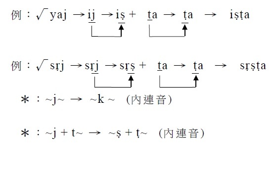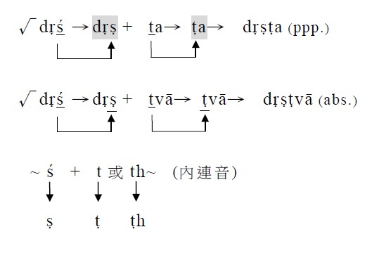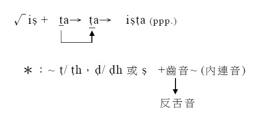 2. 在一字之中的ś與t/ th結合時,ś變成ṣ,t/ th則變成同種的反舌音ṭ/ ṭh。