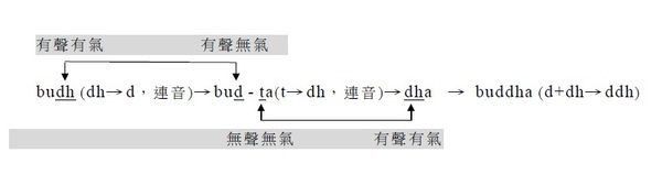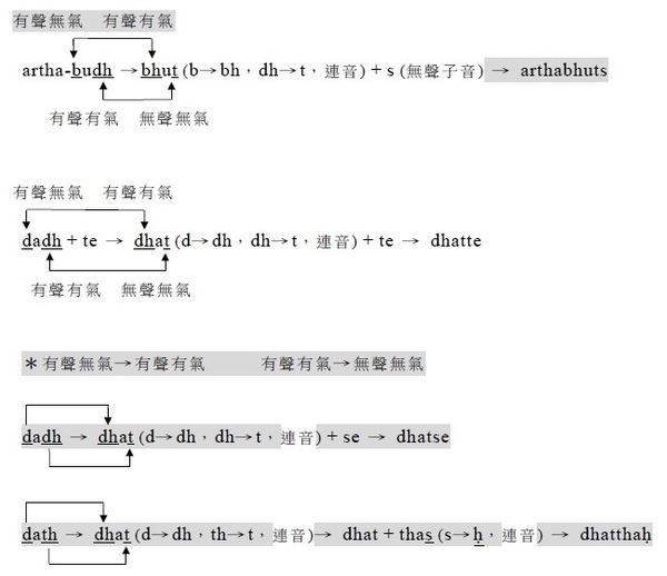 2. 若其後所接的無聲音是t/ th,則有聲有氣音變成同種類的有聲無氣音,t/ th改成dh。