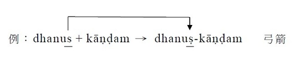 . §46. havis / sarpis / āyus / dhanus等字,如以k/ kh/ p/ ph開頭的名詞結合作成複合詞時,最後的s不變成ḥ而變為ṣ。