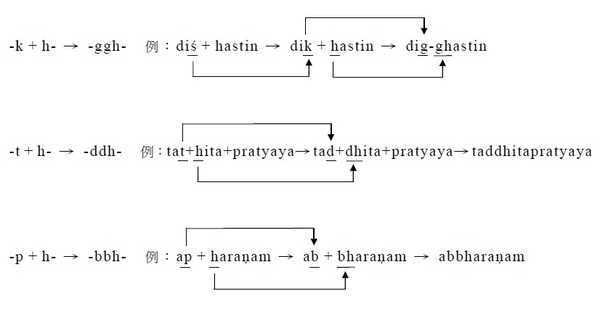 . §47. 在一字最後的k/ ṭ/ t/ p,其後為h時,分別變成有聲音g/ ḍ/ d/ b,但此時h變成和這些音同類的有氣音。