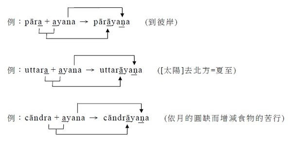 4. 名詞語基之末的ṛ / o / au,在ya之前分別成為r, av, āv ﹝例1﹞:pitṛ (m.stem. 父) → paitr + ya → paitrya (adj.stem.) 祖先的 ﹝例2﹞:nau (f.stem. 船) → nāv + ya → nāvya (adj.stem.) 船的 ﹝例3﹞:go (m./f.stem. 牛) → gav + ya → gavya (adj.stem.) 牝牛的