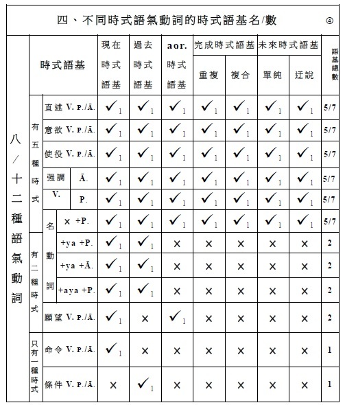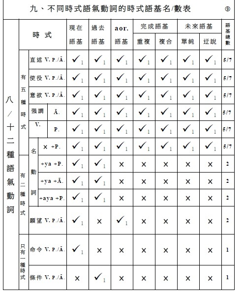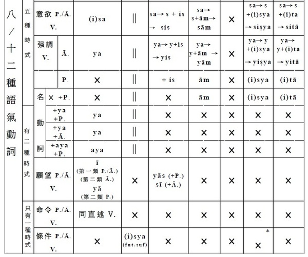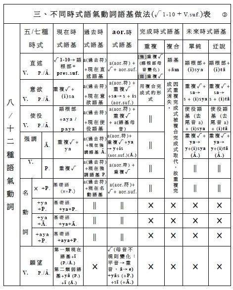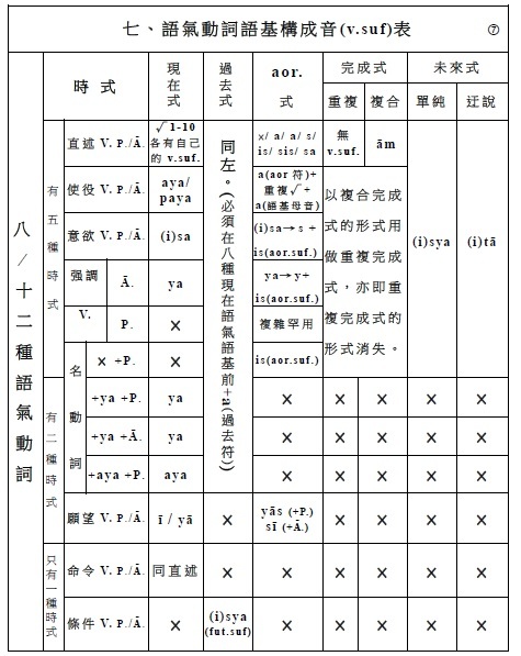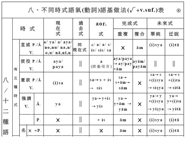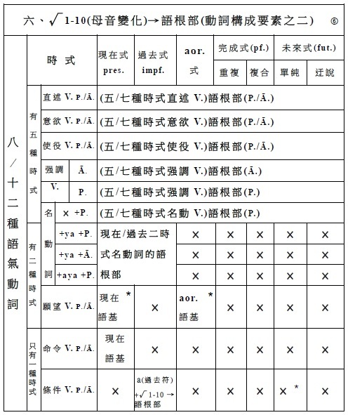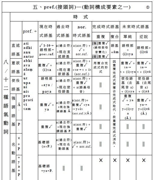 簡介梵文動詞(二) 一、時式 / 時式語基 / 時式動詞的名數 (一) 時式 名/數 (5/7) 1‧現在式 (1) 2‧過去式 (1) 3‧aor.式 (1) 4‧重複完成式 (1) 5‧複合完成式 (1) 6‧單純未來式 (1) 7‧迀說末來式 (1) . (二) 時式語基 名/數 (5/7) 1‧現在時式語基 (1) 2‧過去時式語基 (1) 3‧aor.時式語基 (1) 4‧重複完成時式語基 (1) 5‧複合完成時式語基 (1) 6‧單純未來時式語基 (1) 7‧迀說末來時式語基 (1) . (三) 時式動詞 名/數 (5/7) 1‧現在式時式動詞 (1) 2‧過去式時式動詞 (1) 3‧aor.式時式語基 (1) 4‧重複完成式時式動詞 (1) 5‧複合完成式時式動詞 (1) 6‧單純未來式時式動詞 (1) 7‧迀說末來式時式動詞 (1) . (四) 時式語基/ 名/數 /做法: 1‧現在時式語基 (1):√1-10 + 現在時式語基 2‧過去時式語基 (1):a(過去符) + 現在時式語基 3‧七種aor.時式語基 (1):a(aor.符) + √/重複√ + 七種aor.時式語基(×/ a/ a/ s/ is/ sis/ sa) 4‧重複完成時式語基 (1):﹝強﹞重複√母音變化 ﹝弱﹞重複√ 5‧複合完成時式語基 (1):語根/語基 + ām 6‧單純未來時式語基 (1):√ + (i)sya 7‧迀說末來時式語基 (1):√ + (i)tā . (五) 時式動詞/ 名/數 /做法: 1‧現在式時式動詞 (1):現在時式語基 + 現在式時式語尾 2‧過去時式動詞 (1):a(過去符) + 現在時式語基 + 過去式時式語尾 3‧七種aor.時式動詞 (1):a(aor.符) + aor.時式語基 + aor.式時式語尾 即:a(aor.符) + √/重複√ + 七種aor.時式語基(×/ a/ a/ s/ is/ sis/ sa) + 二種aor.式時式語尾 4‧重複完成式時式動詞 (1):重複完成時式語基 + 重複完成式時式語尾 5‧複合完成式時式動詞 (1):複合完成時式語基 + 複合完成式時式語尾 6‧單純未來式時式動詞 (1):單純未來時式語基 + 單純未來式時式語尾 7‧迀說末來式時式動詞 (1):迂說未來時式語基 + 迂說未來式時式語尾 . . (四─3.) 七種aor.時式語基做法: (1). 語根語基: a +√ (2). a語基: a +√ + a (3). 重複語基: a +重複√+ a (4). s語基: a +√ + s (5). is語基: a +√ + is (6). sis語基: a +√ + sis (7). sa語基: a +√ + sa . . (五─3.) aor.式時式動詞做法: 【 (1).語根語基、 (2).a語基、 (3).重複語基、 (7).sa語基 】+ 第一種aor.式時式人稱語尾 → aor.式式時動詞 【 (4). s語基、 (5). is語基、 (6). sis語基 】 + 第二種aor.式時式人稱語尾 → aor.式式時動詞 . . . 動詞(六)