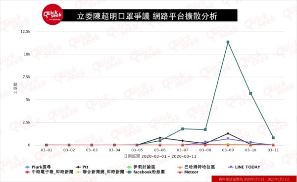 根據QuickseeK輿情系統的聲量趨勢分析顯示,陳超明5日「救時中」說一出,網友討論聲量日益升高。而媒體與網友的批評,也引起陳超明不滿,3月9日一早在立法院質詢時,陳超明不僅硬凹,說自己其實是希望能透過民間製作「口罩套」甚至火力全開,砲轟音樂人許常德「是垃圾人在講話」,強調自己是30年有經歷的政治人物,不會亂提方案,隨後更反問在場的官員諸公們「我叫做廢物質詢嗎?」對此,網友一面倒表示「笑死!沒有很廢、只有最廢」;隨後媒體訪問時,陳超明一聽到媒體提起「口罩」二字,便激動地暴怒辯解,反批媒體曲解報導亂講話,還邊走邊罵,大嗆網友「很亂!腦殘!我說網友都是腦殘!」、「不接地氣,不懂高科技在那邊亂講話」、還說都是1450網軍斷章取義,「才不會曉得我偉大在哪裡!」,與網友之間的戰火一發不可收拾,這也讓陳超明的網路聲量單日就突破13000筆。