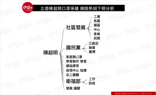 針對本次陳超明的狂言,熱詞下探的分析也發現,除了認為「陳時中部長接受陳超明的質詢簡直就是在浪費時間」外;由於近日適逢新任黨主席上任,改朝換代的時間點,陳超明回嗆自己資深,也讓網友翻出陳30年以來的從政史,表示「靠!納稅人的稅金養這種人30年欸!」其所屬的國民黨更掃到颱風尾,網友大呼「國民黨真的該世代交替了」。而陳所提出的「社區自製高科技口罩」,強調能水洗50次且具有防護效果,對此網友也調侃「國民黨到底能秀下限到什麼程度」。