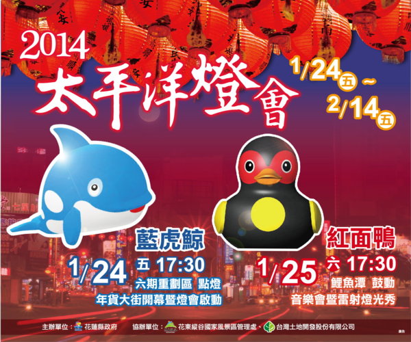 花蓮縣政府新聞(2014/01/28) 花蓮縣政府25日傍晚於壽豐鄉鯉魚潭舉辦「2014太平洋燈會-鯉魚潭燈區」點燈儀式,由花蓮縣長傅崐萁與多位貴賓共同點燈,繼昨日巨型可愛的藍虎鯨於六期重劃區與各位鄉親見面後,最具在地情感、最喜氣的巨型紅面鴨也在鯉魚潭隆重登場,吸引了大量遊客湧入鯉魚潭,現場氣氛熱鬧無比。 傅縣長致詞時表示,太平洋燈會是臺灣第一個從除夕前一直舉辦到元宵節最本土、最有年味的臺灣燈會,搭配花蓮在地優質農特產品的年貨大街,將陪伴所有鄉親迎新嶄新、幸福的一年。 他指出,最正港本土的紅面鴨平易近人,療癒指數破表,不論大、小朋友都可以近距離接觸,歡迎全台民眾大手牽小手到花蓮來欣賞,為今年的寒假留下最深刻的感動。 傅縣長也表示紅面鴨商標權屬於花蓮縣政府,但縣府歡迎各縣市都做一隻可愛的本土鴨,並開放大家開發及製作紅面鴨相關商品,一同來愛惜本土、疼惜臺灣。 花蓮縣議會議長楊文值、徐雪玉議員、縱管處處長洪東濤、壽豐鄉長張懷文、秀林鄉長許淑銀及觀光局多位貴賓也到場共襄盛舉,共同見證這場燦爛的點燈儀式。 今日的點燈儀式,主辦單位也安排文蘭國小學生表演充滿活力的森巴鼓,並由洄瀾境民俗藝陣帶來「震天戰鼓‧迎馬年」傳統鼓陣表演,隨後更施放雷射燈光秀和璀燦煙火,帶給現場鄉親和遊客一場豐盛的聲光饗宴。鯉魚潭除了花蓮特有的巨型Q版紅面鴨,周邊也佈置百盞大紅燈籠及絢麗燈樹,美輪美奐讓在場鄉親紛紛驚呼「好美!」。 2014太平洋燈會特別於鯉魚潭展示巨型Q版紅面鴨,外型巨大卻喜氣可愛,不同於荷蘭霍夫曼所創作的黃色小鴨,是基於本土情感所萌發出的創意,展現台灣人日常生活中的庶民文化,更能喚起在地鄉親的共同回憶,並讓國內外遊客了解本土的民俗風情,並藉著親近可愛的紅面鴨獲得心靈的滿足及安慰。 縣府觀光暨公共事務處處長蘇意舜表示,花蓮的紅面鴨不同於黃色小鴨只能拍照,鄉親及旅客可以攜家帶眷踩著腳踏船近距離接觸,在秀麗的潭面上邊踩船、邊賞鴨,共享親子之樂。同時,藉著紅面鴨的魅力,也能帶動周邊業者商機,為花蓮觀光注入新活力。 花東縱谷國家風景區為搭配紅面鴨的展出,在1月24日至2月14日期間,每天安排在地樂團演出各式音樂會及歌謠,讓民眾及遊客可以邊賞鴨,邊聽歌,增添傳統節慶歡樂氣氛,讓所有來訪遊客都能感受到花蓮人的真誠與熱情。花蓮縣政府邀請大家春節假期前往鯉魚潭欣賞參觀,帶著滿滿幸福感迎向新的一年!