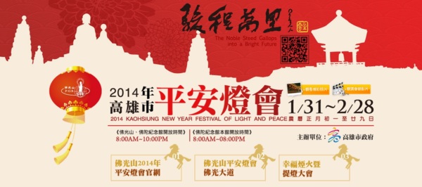 一元復始,萬象更新,佛光山及佛陀紀念館於新春期間,特以「駿程萬里」為主題,舉辦為期一個月的高雄市平安燈會。 本山以傳統平安燈的佈置跟來山大眾拜年,您可參與上燈法會、禮千佛法會、大悲懺法會、叩平安鐘、殿堂參拜、朝山禮佛,讓自己福慧增長。 走一趟佛光大道,曼陀羅花園聳立10公尺高的駿馬主燈,還有十二生肖花燈、創意園藝區、騎龍觀音、200公尺的「天堂在哪裡」花燈隧道、祥龍獻瑞、花燈台、佛陀行畫圖、平安燈牆、水族箱、施茶亭等,將讓大家「大開眼界」。 佛陀紀念館的春節活動更是多采多姿,「金佛殿」、「玉佛殿」的法師帶領信眾禮佛祈福,本館大覺堂有河南雜技及婺劇等春節特演。 同時,初一至十七將施放煙火及舉辦提燈大會,2/4 (初五) 舉行「地宮珍寶入宮圓滿法會」及「星雲大師佛法真義講座」。 大家來佛光山歡慶春節的同時,也可以把歡喜、幸福、智慧帶回家。祝福大家:「福慧增長,身心自在;日日好日,時時吉祥。」