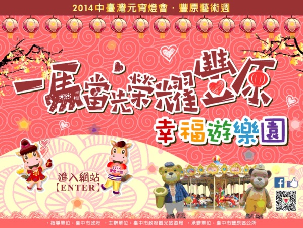 「2014中臺灣元宵燈會-豐原藝術週」2/9-2/16連續8天豐原地區展出 台中日報(2014-02-04) 「2014中臺灣元宵燈會-豐原藝術週」活動訂於103年2月9日至16日共8天(農曆正月初十至正月十七日)於臺中市豐原區公所及其周邊景點(藝文廣場、田心公園、田心里活動中心、太平洋百貨、墩腳公園、心鎖橋…等)熱鬧舉行,臺中市政府觀光旅遊局及臺中市豐原區公所為傳承延續每年豐原元宵燈會的佳節盛況,今年更勝以往,推出八大主題展區(五米飛天馬、卡哇伊泰迪熊、創藝花卉馬、超大旋轉木馬、鋼鐵機械展、四大靜態特展、愛戀心語、十二星座花燈、祈福光廊),眾星雲集八大主題晚夜(太陽哥哥、彩虹姐姐、楊蒨時、許富凱、蔡佳麟、荒山亮、黃文星、陳隨意、郭婷筠、無雙樂團…)等,要讓參加民眾過一個絕對值得回味再三的的2014中臺灣元宵燈會-豐原藝術週。 今年生肖年為馬年,「2014中臺灣元宵燈會-豐原藝術週」以飛天馬為主題燈,運用光影光雕燈光效果,利用影像投射,6隻小馬飛舞環繞著飛天馬主燈,搭配主題音樂,目不暇給的聲光秀,絕對讓你一看再看,2月9日點燈儀式將由臺中市胡市長出席點燈,邀請民眾一起來「一馬當先榮耀豐原」主燈點燈秀。 今年元宵節適逢2月14日西洋情人節,燈會副燈區展出的愛戀心語及十二星座花燈,讓您甜甜蜜蜜濃得化不開,記得帶著您的心愛的另一半,來尋找自己的星座,還有裝置藝術愛戀心語區一起合影留下屬於你們的最珍貴回憶。 中市豐原區公所張區長瀞分表示,今年的豐原藝術週同時舉辦了創意花燈競賽,廣邀豐原地區的各級機關學校、社區參加競賽,邀請專家公正公平的評審出得獎作品,除了晚會活動中頒發獎金獎座外,得獎的作品也將於藝術週期間展出,記得揪團來參觀,這是炫耀的時刻,榮耀屬於你。 規劃了八大主題晚會,有豐原在地社團表演,社區、幼兒園的活力表演,街頭藝人秀、異國風情貝斯秀,猜燈謎送小禮,當然最重要的是邀請到國內知名藝人演出,每日皆有不同主題,懷念金曲、熱歌勁舞、搖滾ROCK,2月14日情人節還有特別節目,特別邀請現場情侶、甜蜜夫妻參加,有眾多驚喜等著您,一連八天,天天精彩,詳細活動內容歡迎上豐原區公所網站及粉絲頁查詢。 除了八大主題展區好看好玩好藝術外,還將小朋友最愛的大型旋轉木馬搬到展區來,要讓民眾免費遊玩,還有鋼鐵機械人展,親愛的家長們趕快帶著你的小朋友來幸福遊樂園度過一個歡樂有趣的元宵佳節! 今年中臺灣元宵燈會可愛造型馬年小提燈-小飛馬,「立馬來 送提燈」,豐原區公所將於燈會期間每日下午6點於活動主服務臺開始發放,每日限量500個,送完為止,想要的民眾記得準時至服務台領取。或是「立馬捐 傳愛心」,只要民眾於活動期間捐103年1、2月份發票10 張,即送馬年小提燈和摸彩券各1份,晚會活動中辦理摸彩贈奬活動,另「立馬拍 秀自我」於活動現場個人入鏡,拍照並完成打卡至FB臉書者,就可於晚會期間向活動主服務台兌換1張摸彩劵,摸彩獎品獎項有腳踏車、液晶電視、桌上型電腦、造型隨身碟等多項好禮,歡迎民眾索取拿大獎,好康優惠獎不完,來豐原藝術週就對了。 臺中糕餅舉世聞名,豐原藝術週亦邀請大臺中知名糕餅名家,於燈會現場設置糕餅攤位進行展售促銷,逛燈會的民眾看表演外還可選購知名臺中各式糕餅名產當伴手禮,送禮自用兩相宜。此外豐原地區農特產品也在藝術週會場展售,今年的豐原藝術週要讓你吃新鮮顧健康,看燈會一起拚經濟,豐原區公所並設置美食小吃夜市攤位,豐原在地特色小吃、社區媽媽攤位,有夜市常見美食、套圈圈、打彈珠…等,讓參觀民眾來逛燈會啖美食,享受一個歡樂吃到飽的元宵新春佳節。