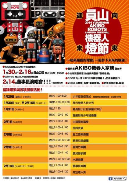 2014員山燈節以超越傳統,迎向未來-「機器人燈節」這樣的主題元素,結合童趣、科技、未來感,作為員山燈節重新出發的嶄新年。眾所矚目「員山HOPE希望機器人」主燈於元月27日進場,員山燈節從1月30日(除夕)起至2月16日(總計18天),將在員山公園,打造一個和全台灣不一樣的燈節,歡迎春節期間,闔家蒞臨員山賞花燈、觀美景、嚐小吃、看煙火。 2014員山機器人燈節,特別邀請知名藝術家Akibo李明道,專為員山燈節設計創作的「員山HOPE希望機器人」主燈,有4米5高,以環保手工木作而成,內含12組閃爍的LED模組,臉部有特製的LED表情模組,燈節期間每天晚上17:30~22:00,每30分鐘的燈光秀,主燈會有不同的表情變化。另外第二主燈為「光蟲機器人」,光蟲高180公分,400公斤重,有含二片太陽能板,四個鋰電池,還有老師歷年來設計的機器人家族,都將在員山公園的每個節點給民眾驚喜。2014員山機器人燈節,除豐富精采的展覽當然還有精彩的表演活動,大年初一、初二有宜蘭縣青少年國樂團等音樂表演,2月8、9日(大年初九、初十)有表演活動暨農民節表揚,邀請台灣竹樂團、夏之愛樂樂團、蘋果兒童劇團、水屋樂團等,重頭戲是2月14日元宵節董事長樂團及高空煙火秀,掀起燈節的最高潮,精采可期。 活動粉絲團網址:https://www.facebook.com/eland.Yuanshan 展出時間:1/30日(除夕)起至2/16日(元月十七)止,總計18天。 展出地點:員山公園(員山鄉復興路) 展出內容: 1. 機器人主燈秀:員山希望機器人 + 太陽能光蟲機器人 2. 機器人藝廊 3. 機器人集體創作(350位學生機器人花燈集體創作) 4. 創意市集