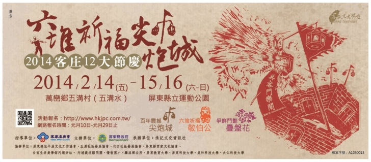 屏東政縣府新聞(2014/02/08) 客庄十二大節慶「六堆祈福尖炮城系列活動」14日在萬巒鄉五溝水;15、16日兩天在屏東縣立運動公園熱烈展開,爭奪第一名10萬元獎金。 屏東縣政府客務處表示,今年的尖炮城比賽參賽隊伍眾多,盛況空前,有許多好吃、好玩、好看的精彩節目輪番上陣,務必要在元宵節給民眾們最棒的饗宴!在比賽部分今年新增「五溝傳統式尖炮城」、「六堆義勇軍尖炮城樂齡組、花木蘭組」、「水上尖炮城」、「全家福闖關尖炮城」等項目,另外增設了跌三烏、六堆大富翁等等……多樣好玩的比賽與活動等待鄉親們一齊參與同樂! 客家事務處指出,「六堆祈福尖炮城活動」係在元宵期間為傳統尖炮城文化推動之活動,經年舉辦不只受六堆地區民眾喜愛更受到來自各地的好評,甚至有外國觀光客前來參與同歡。 縣府客家事務處補充說明,敬伯公方面,特別恭迎六堆伯公來會場安座、賜福,設置祈福橋供鄉親自由前往祈福,讓在地、外來民眾更進一步體驗傳統的常民信仰。盤花是六堆客家特有的祭祀供花,色彩與花種搭配別具巧思。透過創意盤花競賽讓更多人認識客家文化,體驗客家族群慎終追遠禮天敬神之民族特性,請快來參與這一年一度的盛會吧!錯過就要再等一年囉! 客家事務處強調,「六堆祈福尖炮城系列活動」今年將以嶄新的場布、節目及內容,以百年震撼尖炮城、六堆祈福敬伯公、爭鮮鬥艷疊盤花、客家跌三烏、六堆大富翁…等呈現新年歡樂氣氛,活動期間還有規劃50攤六堆客家特色產業商品展售、客庄遊活動,提供民眾吃喝玩樂,到運動公園即可以歡樂過新年。