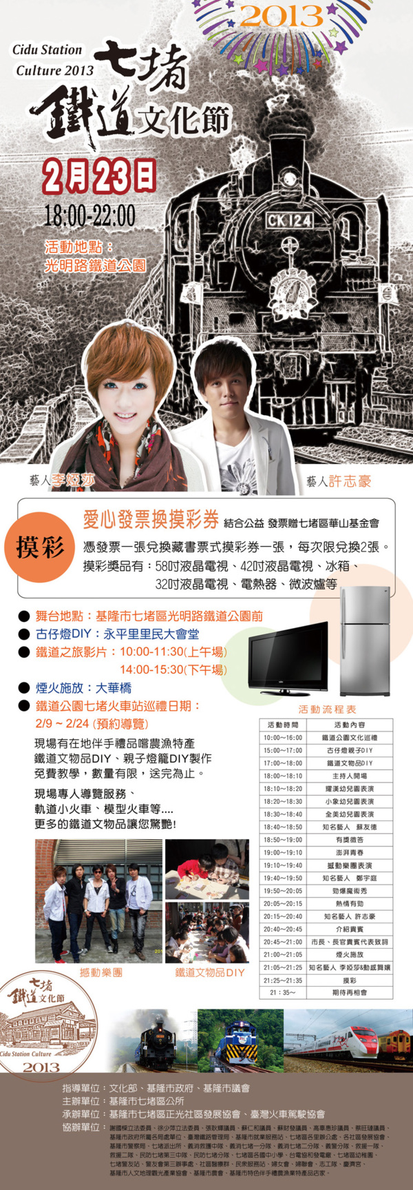 ( 火車上,一個印有菊花圖案的玻璃飲水杯、陣陣撲鼻的鋁製排骨便當,一份對鐵道永遠無法割捨的情感! 2013的七堵鐵道文化節是這樣被勾起的…,舊七堵車站,經過政府與多方關心舊車站去留的民眾,努力奔走下,原貌重建的「鐵道公園」經過2012第一屆的鐵道文化藝術節洗禮後,有著諸多的迴響,引人遐想;為了延續這份濃郁的情感,今年的鐵道文化節加入更多新的元素,環繞「鐵道文化」內涵的著墨與呈現,更多鐵道迷關心並參與,加深了活動本身的文化厚度,規模擴及全市,特別是七堵區市民朋友節慶休閒效益的格局,承辦單位七堵區公所與執行單位正光社區發展協會與臺灣火車駕駛協會,今年以更高規格認真嚴謹的態度,於全體會員的積極熱情引爆下,委請挹注更多的專業資源,讓2013「七堵鐵道文化節」,未演先轟動! 2013的鐵道文化節有幾個特色是值得媒體朋友巡訪的,「延續傳統展現復古風情的鐵道故事性」,在舊七堵車站,可以欣賞一段有趣的「鐵道之旅」影片、讓大小朋友驚呼連連的小火車模型、彷如真實火車的「軌道火車」也將在大家的眼前呼嘯而逝、鐵道文創品diy等,都會讓大小朋友因為參與觀賞、體驗教作,進入「鐵道文化想像空間的自由創作」,無形中種下個人勇氣與自信的種子,快樂無比,提昇親子關係的功效,更是不在話下唷…當然還有更多的活動內容,等著所有市民朋友們參與挖寶! 親子同樂,其樂融融,優質的活動內容一樣被重視與延續著,雖然經費十分有限,但一樣都沒少,每年讓大小朋友開心的親子古仔燈200份DIY製作,一樣在永平里里民會堂進行,和去年不一樣的是,將安排相當數量的古仔燈在鐵公園做贈送;今年的摸彩券也結合了公益,民眾需以發票兌換才可拿到喔;同時摸彩券也是充滿鐵道文化氣息的「藏書券」,鐵道迷可以加以珍藏。晚上開始的晚會舞台節目,除了受大家歡迎的有獎徵答問答、精彩表演外,還將邀請實力唱將,本地出身的知名歌手許志豪、來自中國的上海姑娘「李婭莎」演唱經典好聽的國台語歌曲,當然美麗的煙火也是觀賞重點,多元的活動內容一定會使得參與的民眾感受到濃濃的年節熱鬧氣氛,對於凝聚提昇市民朋友對自己居住環境滿意度的提昇與與城市認同感,不言可喻! 今年活動的積極意義,一方面是希望鐵道公園,在世代變遷下交替的生命力,讓更多人見證、參與;舊七堵車站本身的故事性成為一個再利用的空間,進而讓人思考未來該如何保留鐵道文化,並加入現代的元素,發展出長存的方向?當然民眾參與的部分更需要被鼓勵,而文化力量的重要性,或許可以嶄新的方式,參與公共活動事務,並運用網際網路無遠弗屆的魔力,結合科技開展新局!