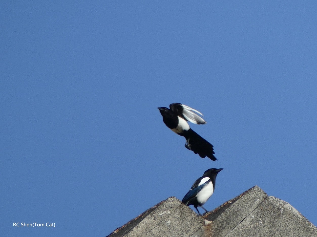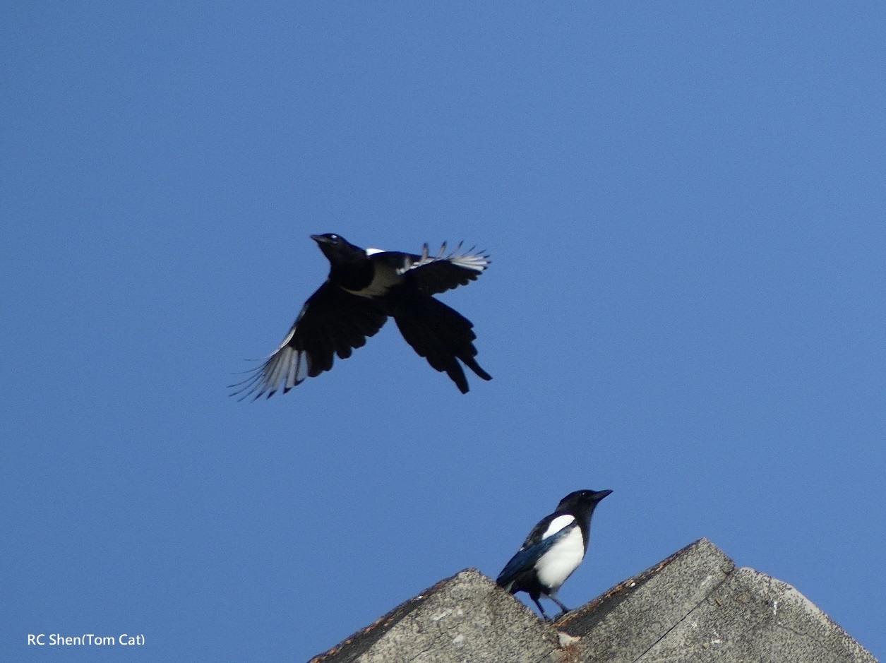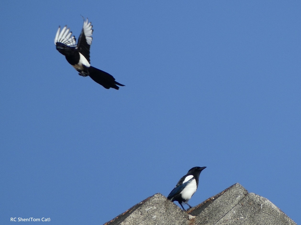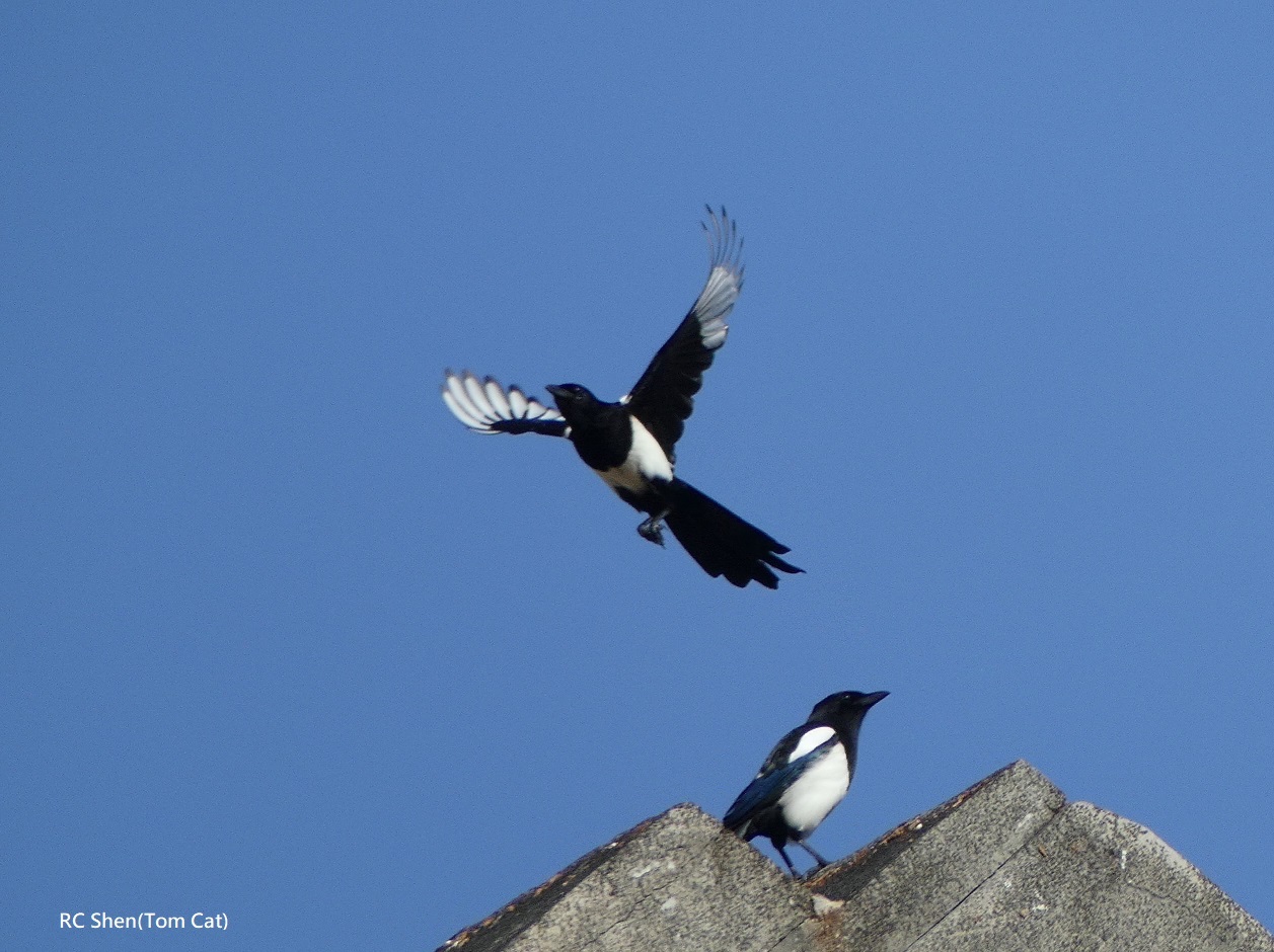 喜鵲鬥鼓嘴展翅起飛? 展現香奈兒黑白的羽翅與變換不同的飛行姿勢,822mm手持連12拍。