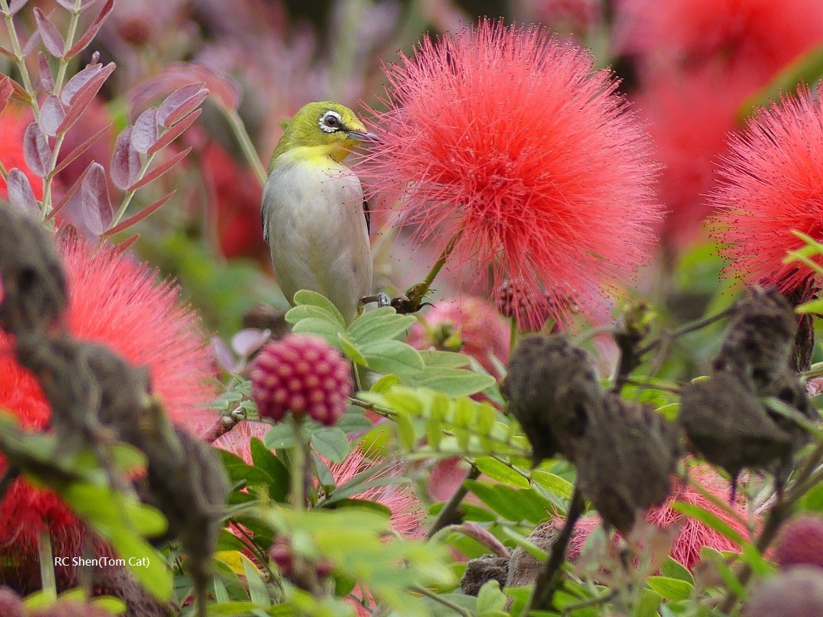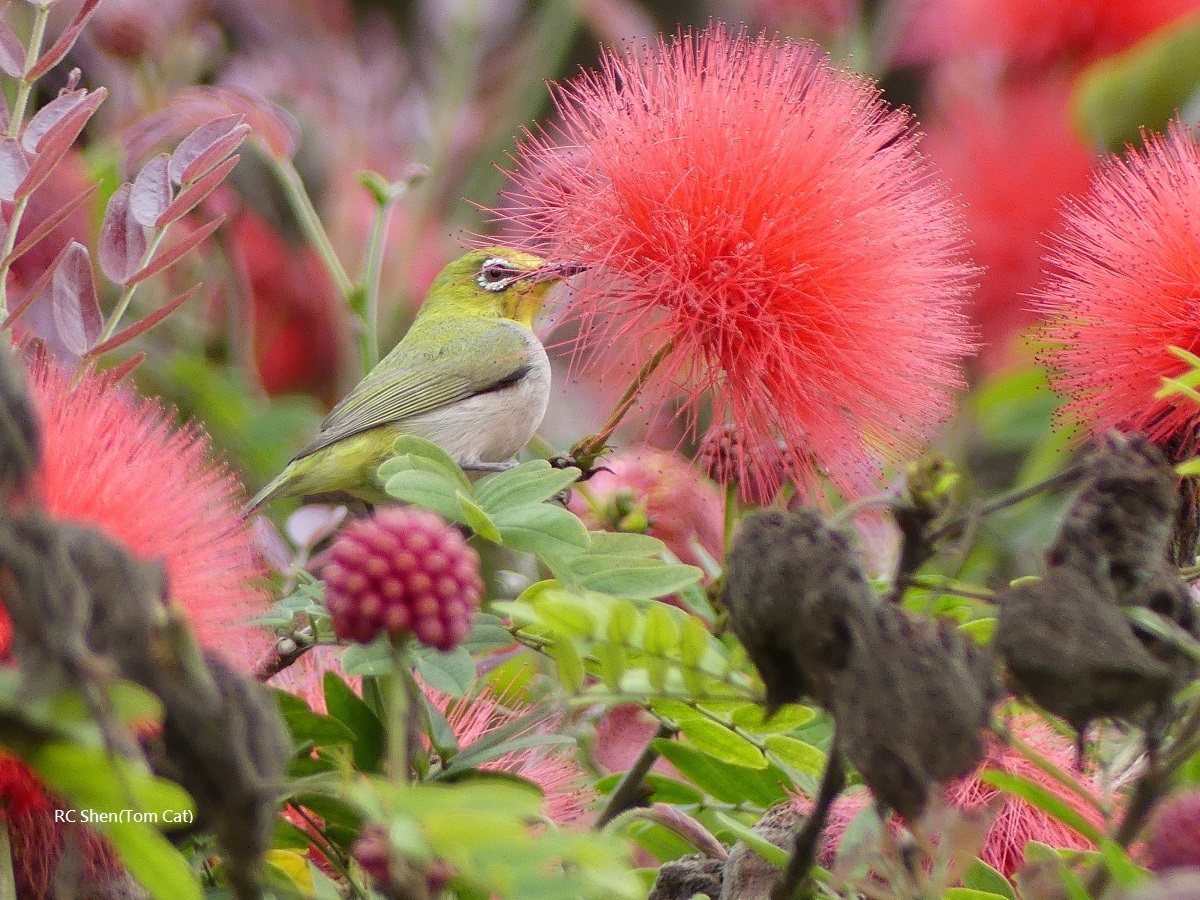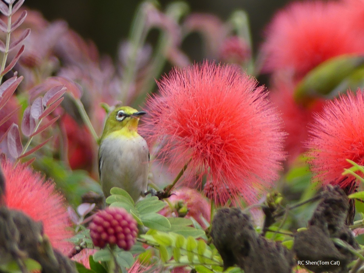 國父紀念館翠湖邊美洲合歡盛開,綠繡眼飛來吃花蜜。綠色羽毛對上紅色花朵,別有風味!