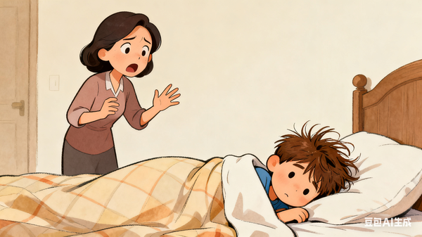 不想去學校 1. 上課時間快到了,媽媽發現兒子還在床上呼呼大睡,趕緊叫他:阿金,快起床! 你快遲到了!