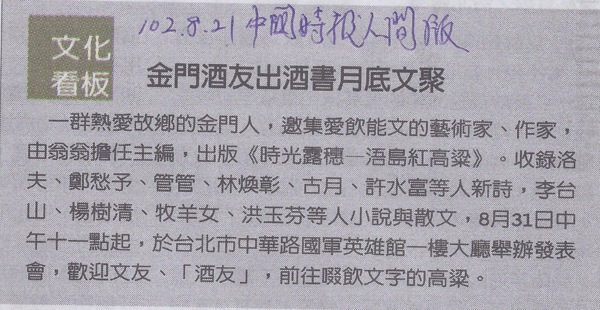 《時光露穗—浯島紅高粱》同時一舉邀集了島內外金門籍的文學、藝術好手,以新詩、散文、小說、攝影、繪畫、書法等創作,一起書寫、一起紀錄了高粱與金門島鄉的共同記憶。規模之鉅、用情之深,將是金門文學最著要的一次集體發聲。 新書發表會,隆重登場。邀請您光臨。 8月31日am10:30~12:00 台北市國軍英雄館(長沙街一段20號)
