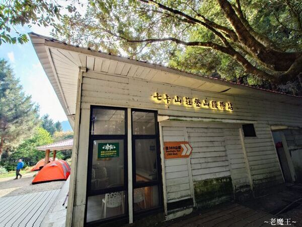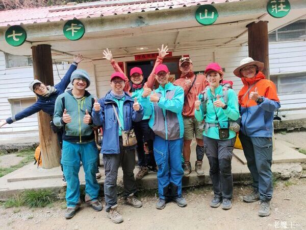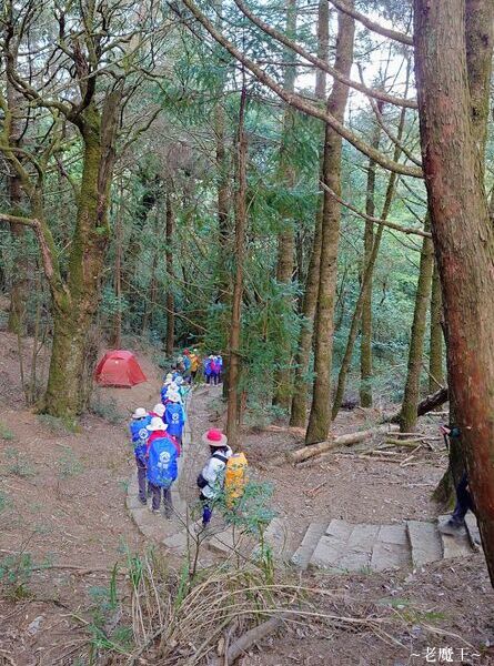 大家在登山口拍照時, 我發現有一小隊似乎出發了 (後來才知道, 原來是被老師帶到旁邊做教學活動); 我身為駐站, 理應比他們提早到達, 因此我趕著出發, 心想 "他們大概消失十幾分鐘了, 我應該可以在 0.4K 以前就追到他們." 不料, 過了 0.5K 還沒看到人!? 過了 0.9K 後, 我確定他們應該是還沒上山, 否則, 以這些小朋友的嬌貴, 我不可能追不到. 因此過 1K 後, 我就悠哉輕步上山, 50 分鐘後來到七卡山莊.