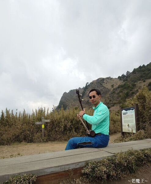 送走第三梯後, 等著迎接第四梯. 駐站的工作, 就是這樣, 一直送往迎來, 做重複的工作, 講同樣的台詞......, 幸好我們都還算有熱誠, 而且都是愛山人, 所以倒也樂此不疲. 聽說今晚要變天, 明天會下大雨, 所以看到第四梯出現時, 我們都報以同情的眼神. 沒想到, 不知道是哪個福星降臨, 原本這幾天看到的 Windy 都說明天會下雨, 結果, 今晚的 Windy 竟然轉性了, 改說明天只是陰天! 4 月 23 日星期四 凌晨起床時, 飄了一絲絲雨. 送走大隊人馬後, 美秀為了避免中午變天, 又是跟著大夥兒出門, 我則補眠到 9:20 am 才起床. 此時居然是大太陽, 咦~ 這麼好的天氣, 如果我窩在山莊裡, 實在是太糟蹋了. 因此揹了胡琴, 於 10 am 上山. 但越往上走,烏雲開始要聚集的樣子!? 我在 3.2 K 處遇到美秀, 翎紋和何主任, 他們三位護著一位號稱膝蓋痛 (卻走得很穩很好) 的小弟弟下山. 我看到他們正在下山, 意志力立刻動搖 "那我還要上山嗎?" 幾經掙扎後, 還是決定繼續往上. 我於 11 am 抵達 4K 處的哭坡觀景台, 便在這兒休息, 拉胡琴自娛一番.