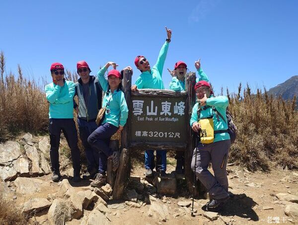 分配好床位, 吃過晚飯後, 我們享用惠伶帶來的聖女番茄. 學生們此時要集合聽家書, 我們則趁機彼此敘舊. 接著, 所有嚮導, 老師和醫護人員召開會議, 針對今天的狀況, 提出討論, 並提醒明天的注意事項. 晚上的床位有點兒擠, 加上有三個學生出現頭暈或頭痛症狀, 因此我沒什麼睡, 反正明天等他們凌晨出發後, 我再來補眠即可. 4 月 20 日星期一 早上 2:30 am 起床, 吃過早餐, 處理幾個小朋友的狀況後, 在 3:45 am 將全隊送出門, 我和美秀才去補眠. 美秀不到 8 am 便起床, 趕著上山要去拍照. 我多睡 50 分鐘, 直到 9 am 才起床, 看看天色極佳, 便也揹了水壺上山. 前幾天上夜班, 我這兩天的時差調整地不好, 所以還有點兒睏, 幾度考慮到底要不要上山!? 但看到這無敵山色, 明媚春光, 心裡實在是蠢蠢欲動; 遠處的中央尖山和南湖大山似乎不斷地在鼓勵著, 只好繼續喘氣上山. 上了哭坡後, 好幾叢玉山杜鵑恣意開放著. 雪山的杜鵑花, 通常會在 6 月初才滿開全山, 今年似乎提早了一些. 我於 11 am 抵達雪山東峰, 竟然已經有兩小隊學生返程在拍登頂照了. 哇~ 這兩小隊算是快哪! 他們的行程, 是要走過 369 山莊, 到黑森林後, 於 8.3K 處喝奶茶, 才返回雪山東峰拍登頂照. 等這兩小隊拍完, 我們醫療組也來拍合照.
