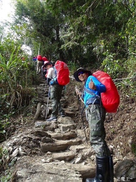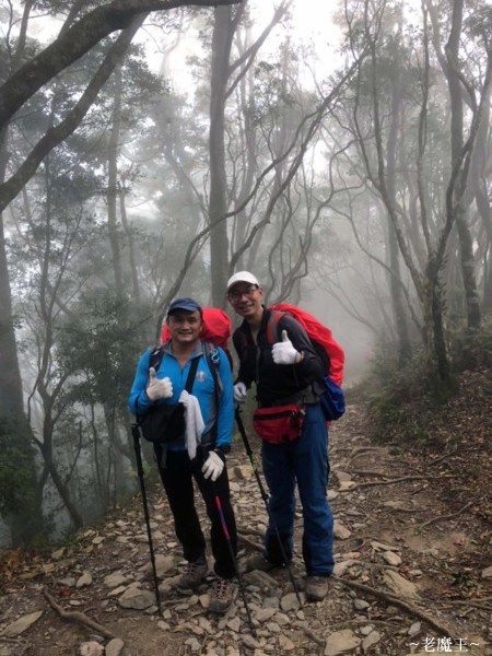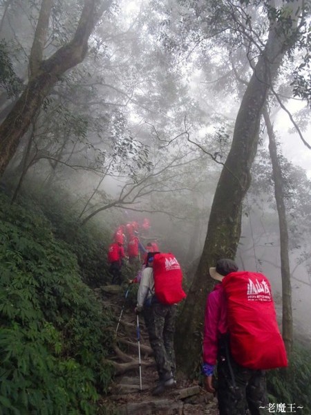 此時已經起霧了, 視線變得稍差. 經過杜鵑樹步道時, 我跟組員們介紹這是台灣最古老的杜鵑樹, 有三百多歲了. 由於霧濃, 加上杜鵑夾道, 這一段山路顯得相當浪漫哪! K2 哥姓王, 他是爬過 8000 公尺以上高山的強人, 這回當我們的三大嚮導之一, 便一直走在最後面押隊, 偶爾跟我們聊聊天 (其實都是我們在說, 他在聽).