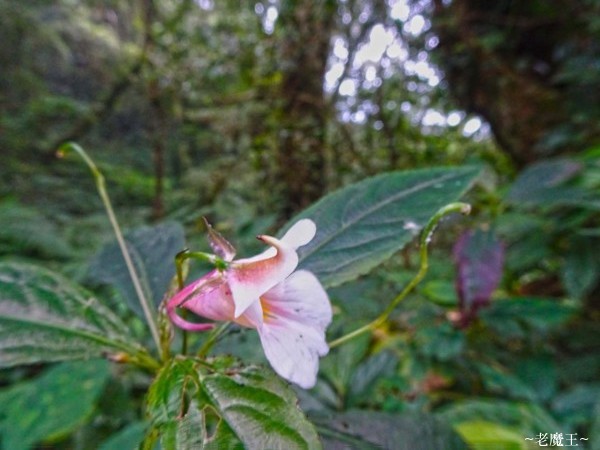 鴨掌秋海棠都謝光了, 許多枯掉的小花瓣卻還垂掛著, 那樣子滿辛酸的. 突然, 一朵貌似馬藍的小花在左手邊出現. 我湊近一看, 才說了聲 "咦~" 的時候, 最後押隊的 K2 哥便說 "這應該是鳳仙花了吧!?" 我仔細看了花距和葉片, 回答說 "對, 這是紫花鳳仙花."