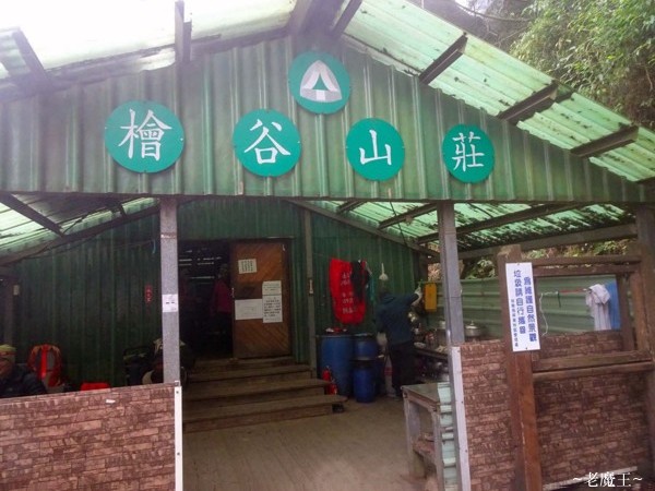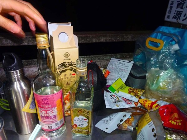 我們先進山莊喝杯薑湯, 我把頭燈拿出來準備要用時, 卻發現電池蓋掉了! 我在附近地上找了好久, 又把背包整個翻開來找, 還是沒看到. 心想 "不會吧!? 這樣我明天就可以睡到天亮, 不用去登頂了!" (其實也正在竊喜, 終於找到藉口可以偷懶了) 誰知不一會兒, 麗香姊突然說 "是這個嗎?" 從地上撿起一個灰色小蓋子; 我一看, 咦~ 對呀, 就是它, 我剛剛明明搜尋了三遍地上, 怎麼就是沒看到咧? 晚餐居然有萬巒豬腳, 害我破例多挖了一瓢飯 (我平常爬山時, 晚餐都只吃兩小瓢白飯, 配一點點菜). 吃過飯後, Roy 拿出從馬祖帶來的高粱酒, 45 度, 但香氣迷人, 口感也不錯. 千泰拿出另一瓶 53 度的高粱 (怎麼都是帶高粱酒啊?), 加上幾位夥伴的零嘴, 一時之間, 好像在辦同樂會了!