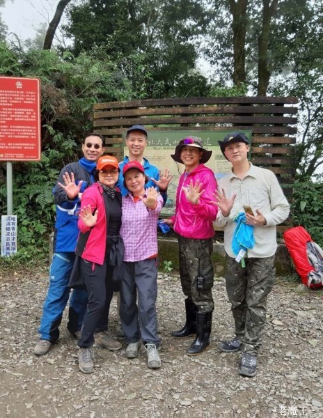 Abby 姊收了大家的身分證去巡山員那兒登記, 大夥兒稍作休息, 喝水並補充能量. 我們第五組總共六位, 除了組長 Andy 之外, Roy, Roger 和慧群姊是我早就認識的, 至於 Aria 則是新認識的朋友. 大家比著 "5", 表示我們是第五組.