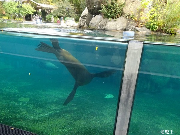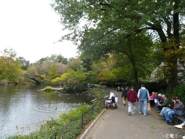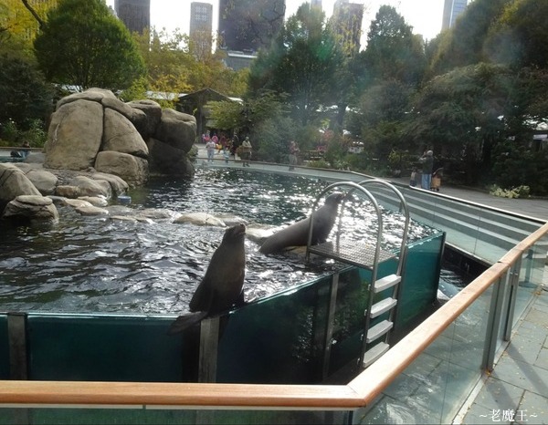 我們在這兒吃午飯, 然後到西側參觀兩座寫滿罹難者名字的紀念池. 由於川普總統的許多倒行逆施, 美國議會把政府的許多資金凍結, 導致這一個月來美國許多公家機關都停擺, 公務人員因此開始放無薪假 (但後來明芝說, 只要預算通過, 薪水會追加回去). 這 911 紀念博物館倒是繼續營業 (要買門票), 表示, 可以營利的單位, 政府還是會讓它繼續賺錢, 非營利單位就趁機擺爛. 然而, 這 "擺爛" 的動作, 後來嚴重影響到我下一座城市的旅遊, 害我更討厭川普了, 呿~ 下一站來到中央公園. 我事先就跟桂津說 "我來中央公園好幾次, 每次到不同的區域, 但到目前為止, 還沒全部逛完過!" 中央公園真的很大, 裡面又有許多不同的設施和景觀, 所以我總說這座公園是紐約人的幸福. 原本以為 10 月底來這兒, 可以看到一大片楓紅, 或滿眼金黃色的枯葉; 不料, 竟然還相當翠綠, 真可惜. 這一區逛到 "西洋棋山丘", 在枯藤木頭糾纏的布置中, 每一張桌子上畫了西洋棋的棋盤, 可供遊客在這兒乘涼下棋. 桂津想去參觀動物園, 剛好我從沒去過, 便陪她進去. 這動物園的規模很小, 中央大水池有兩隻海獅游來游去, 透明的玻璃牆, 可以讓我們持續看到牠們. 爬蟲類不多, 但有專門的暗房將之分門別類; 企鵝館有點兒冷, 但裡面倒是有好幾種不同品種的企鵝. 雪豹好美, 而且只用鐵絲柵欄圍住, 牠卻似乎沒有衝過來嚇或咬遊客的意念. 有三隻棕熊, 雖然都是母熊, 體型還是很巨大. 鳥園是開放性的, 而且有些鳥大概已經習慣遊客了, 居然可以離我不到一公尺遠還不會飛走. 餵食時間快到, 工作人員在另外一區餵海豹, 結果這一區的海獅已經忍不住地爬上岸來引頸企盼. 動物園的門票, 可以參觀三個園區, 我們來到小朋友園區, 原來裡面是一些可愛動物, 麝香豬, 山羊, 兔子, 烏龜等等, 可以讓小朋友和動物互動. 第三園區是看 4D 電影, 桂津問我 "什麼是 4D?" 我說我以前的經驗, 就是在 3D 中會加上微風, 噴水, 椅子震動等等的臨場感, 就是第 4 D.