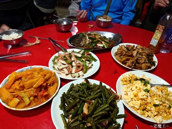 每個人先排隊, 等水燒好後, 自己提一桶熱水去浴室, 混著冷水來洗澡. 我小時候住在很窮的眷村, 每次遇到颱風停水停電時, 我媽媽會帶我們到遠一點的朋友家洗澡, 就是用這種方式洗, 所以對我而言, 竟有一種懷舊的喜悅. 更何況, 在山裡能夠洗熱水澡, 我已經覺得很享受了. 晚餐非常豐盛, 每個人都努力地吃, 居然還吃不完.