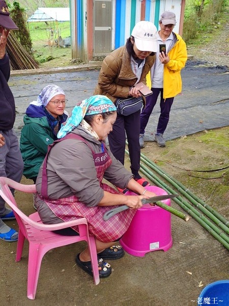 原以為接下來的砂卡礑林道是很輕鬆愉快的, 渾沒想到剛剛揹重裝從山下上來, 已經登高大約 900 公尺, 有點兒累了; 現在這林道竟然不是平坦的 (還是有高有低, 只是落差很小), 我們走著走著, 居然走到有點兒厭世! 我還以為只有我這麼想, 後來才知道阿圖哥也覺得這一段走起來好累. 奇怪, 這一段明明充滿詩情畫意, 而且起伏極小, 應該是令人愜意且舒服的林道呀! 途中有經過一戶人家, 後來看到了明天會前往立霧山的岔路. 看著里程數標記, 知道我們越來越靠近民宿了. 終於, 我們在 3:30 pm 抵達彩虹屋民宿. 民宿老闆是一位退休警察, 他把自己的家園整理地相當整潔優美. 我們分好房間, 放下背包後, 先喝老闆娘煮好的熱冬瓜茶. 我覺得很淡, 但來自韓國的 Ken 卻讚不絕口, 直稱非常美味, 還問我們這是什麼茶. 太管處的工作人員要體驗原住民的生活, 因此老闆娘教他們 DIY 做竹筒飯.