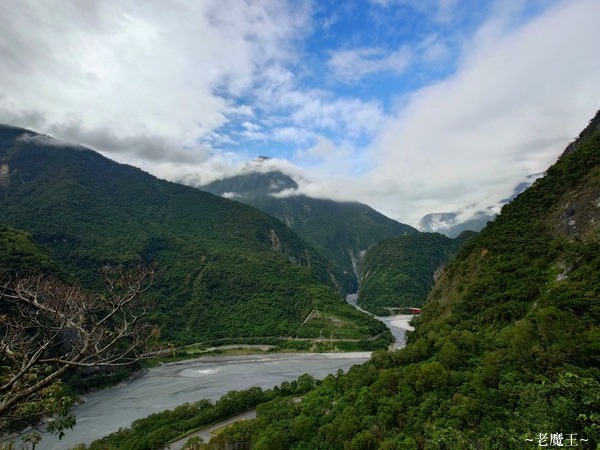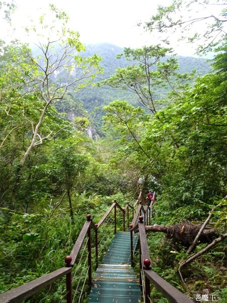 今天的行程, 要從太魯閣遊客中心先爬得卡倫步道 (1.3K), 接 2.3K 原始林地到大禮部落, 再踢 6.4K 的砂卡礑林道到大同部落. 一開始的得卡倫步道, 幾乎都是木板棧道, 而且相當陡. (我後來算過, 最長的一段棧道, 有 59 階!) 但我們不趕行程, 因此每到一座觀景台, 便稍微休息一下, 觀賞立霧溪山谷的風光.